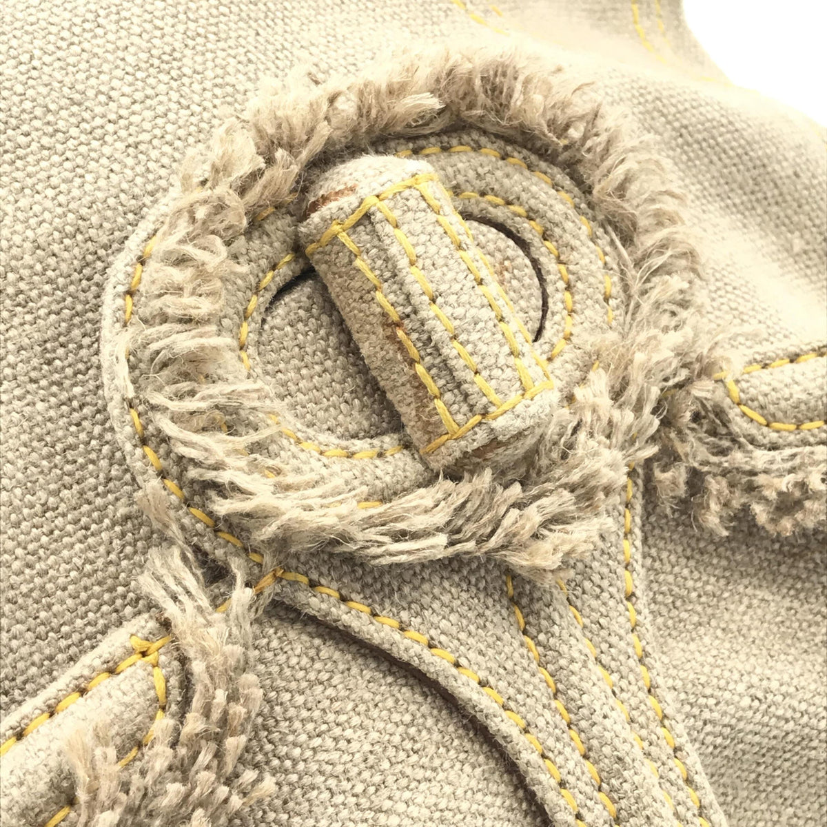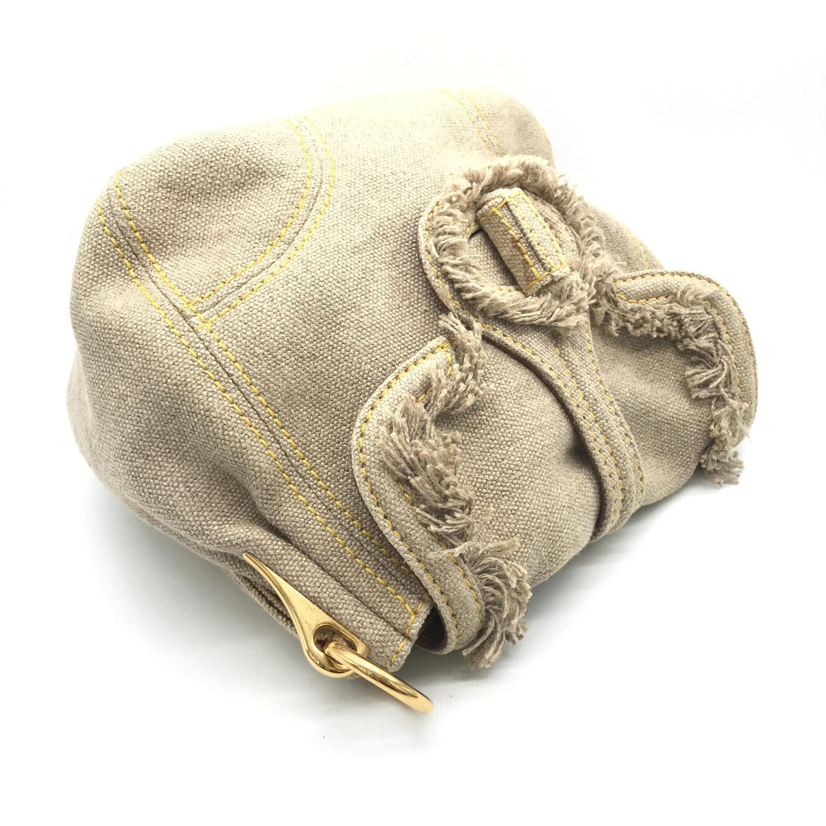 The exterior of the bag features a sophisticated beige canvas adorned with subtle fringe detailing, perfectly complemented by luxurious gold accents. While the metalware shows slight tarnishing, it adds a touch of vintage charm, enhancing the bag’s character and allure.