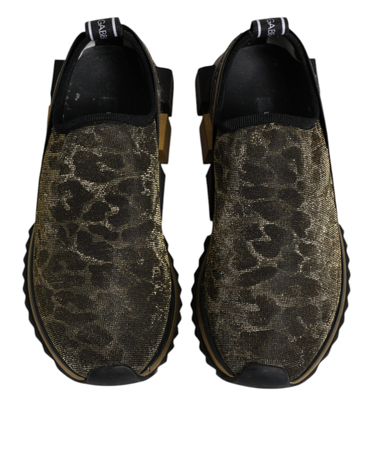 Gorgeous preowned, 100% Authentic Dolce & Gabbana Slip-on sneakers from the Sorrento line in glittery leopard stretch features an elastic back laces with logo, leather footbed with logo label and micro two-tone sole.