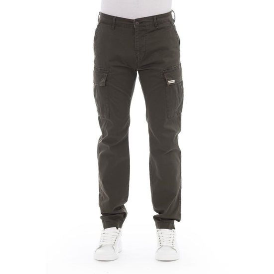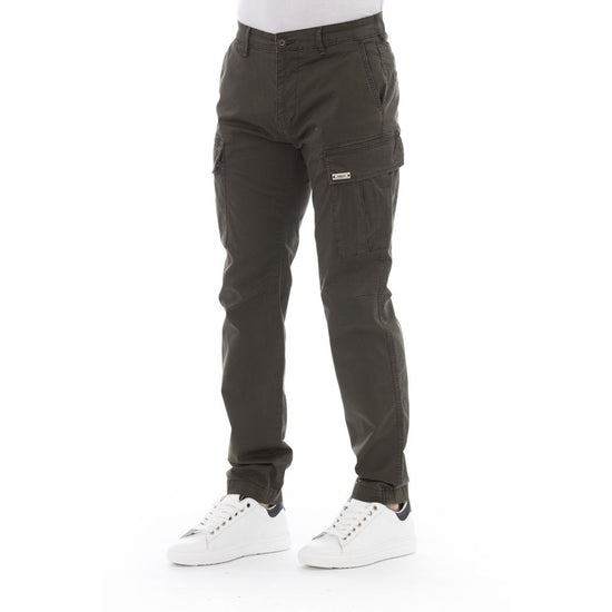 Make a bold fashion statement with Baldinini Trend’s Cargo Trousers, crafted for the modern man who values both form and function. These trousers offer a sleek solid army color fabric that seamlessly blends contemporary style with utilitarian design. Complete with a convenient front zipper and button closure, and an array of pockets, they are not only stylish but practical as well. Designed to stand out in any environment, these cargos are a perfect blend of comfort and trendsetting appeal.