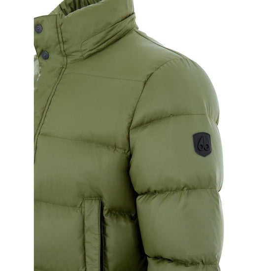 Moose Knuckles Green Padded Down Jacket. Medium-length, front zip fastening with covered buttons, two large side welt pockets with zip closures. Removable hood, light padding, logo applique on the sleeve. Composition: 74% Nylon, 26% Cotton