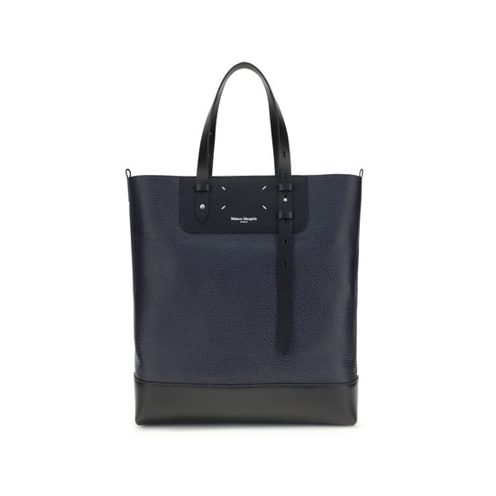 Maison Margiela’s Vertical Tote Bag is a sleek, structured shopping bag made of grained leather with smooth leather inserts on the bottom and top. It is embellished with a contrasting printed logo and iconic contrast stitching on the front. Featuring two adjustable handles and an adjustable and removable leather shoulder strap, it is fully lined for a touch of functional sophistication.