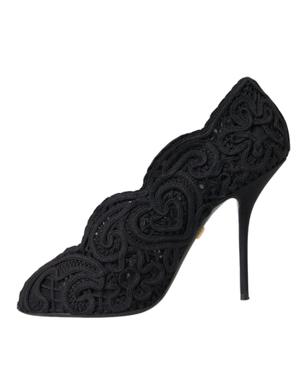 Gorgeous, 100% Authentic Dolce & Gabbana black Bette shoes with a high stiletto heel, an open toe and a figured neckline sewn from openwork cord ricamo.