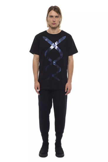 Infuse your wardrobe with the effortless sophistication of Nicolo Tonetto. This round-neck T-shirt is a testament to refined casual style, featuring a sleek black canvas adorned with distinctive prints that capture attention. Crafted from premium cotton, this tee promises both exceptional comfort and a short sleeve cut for a touch of relaxed elegance. Perfect for the modern man who appreciates the blend of bold design and Italian craftsmanship.
