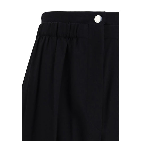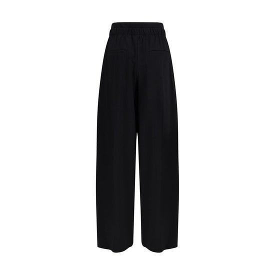 The Wide Stretch Wool Trousers by Sportmax are crafted from stretch gabardine and feature a fluid silhouette with a slightly low waist and a regular fit. The wide leg is defined by front and back pressed creases, while the double gathered waistband introduces a dynamic element that adds movement and a subtle sporty touch. Finished with a branded snap button and concealed zip, this design embodies the brand’s ability to blend tailoring and comfort within a clean, contemporary aesthetic.
