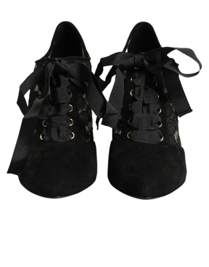 lace-up pumps capture romantic sophistication with a bold floral flair. Crafted from intricate black floral lace, they feature a pointed toe and elegant lace-up ties that wrap gracefully around the ankle. The slender stiletto heel enhances the silhouette, while the delicate design adds a touch of timeless femininity. Perfect for evening wear or adding allure to any refined ensemble.
