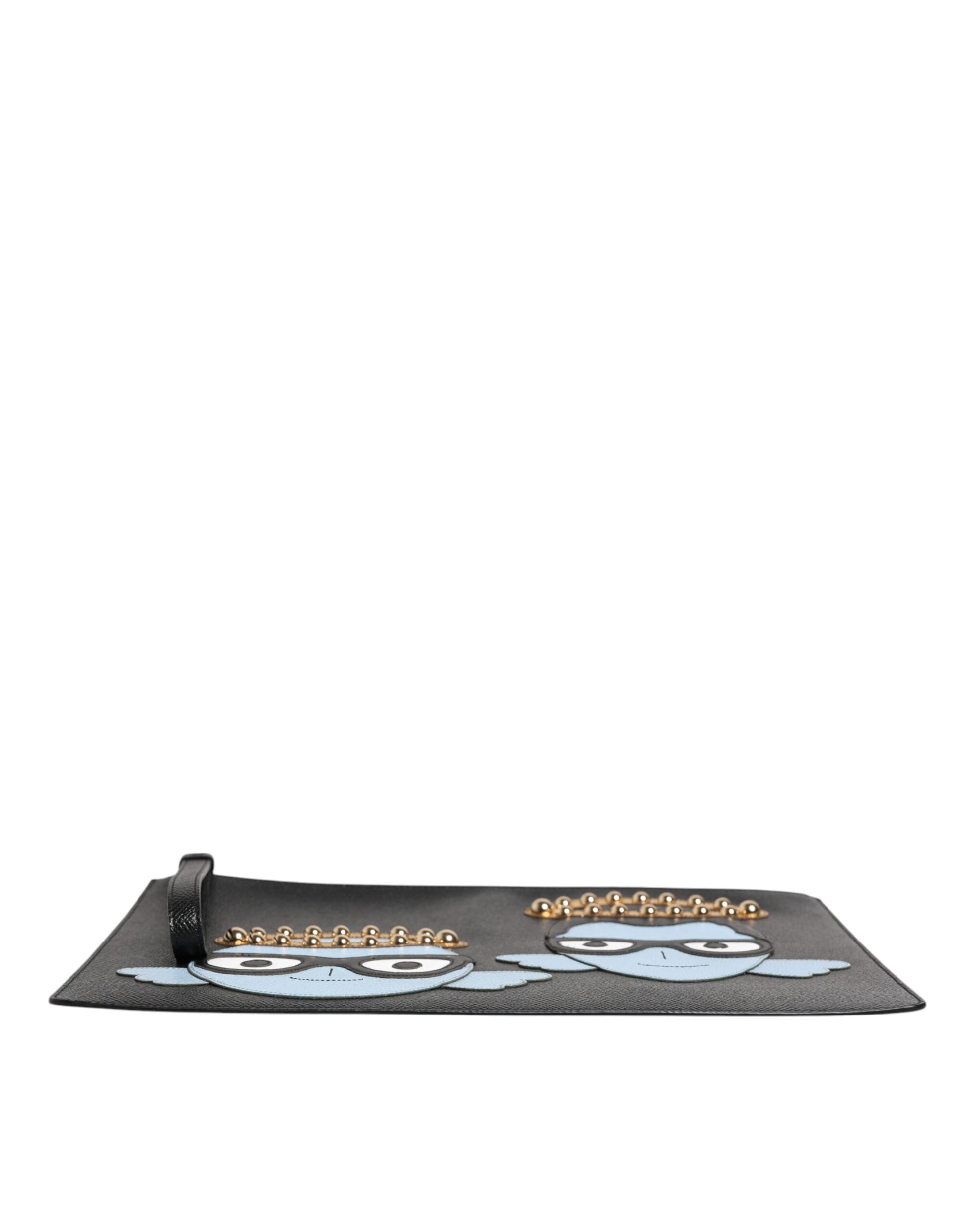 Gorgeous brand new, 100% Authentic Dolce & Gabbana pebbled leather pouch in black. Signature multicolor graphic leather appliques featuring stud detailing at face. Logo applique with stud detailing at back face. Zip closure. Tonal textile lining. Gold-tone and silver-tone hardware. Tonal stitching.