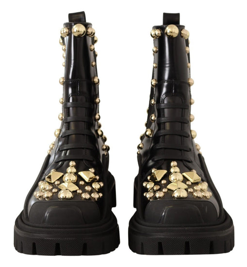 Gorgeous, brand new with tags 100% Authentic Dolce & Gabbana Women polished calfskin combat boots with studs and embroidery.