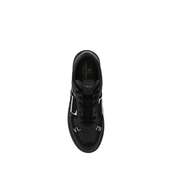 Calfskin VL7N Sneakers by Valentino Garavani, perforated round toe, flat sole, front lace-up closure, contrasting embroidered logo label on front tab, paneled design, webing bands with contrasting iconic brand monogram applied to side panels.