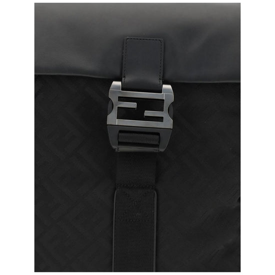 Nylon Flux Backpack by Fendi has a bold, contemporary style, embellished with all-over FF embroidery and a front metal FF logo buckle. Made of nylon with smooth calfskin inserts, it features a tonal leather handle, adjustable fabric shoulder straps and a drawstring closure with a safety buckle. Completing the design are two side patch pockets and a lined interior with a zippered pocket and an open pocket for perfect organization.