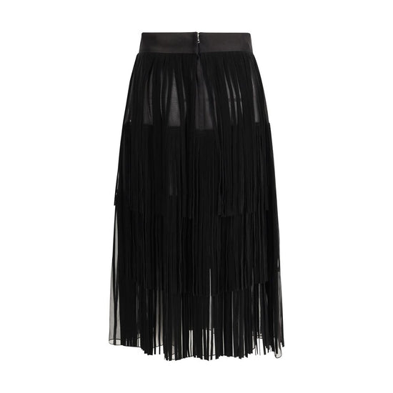 The Organza Skirt by Dolce & Gabbana features a gathered waist that enhances its volume and lightness. Applied fringes add dynamism and movement, transforming an essential piece into a statement of contemporary style. Made from a lightweight yet structured fabric, it reflects a harmonious balance between delicacy and expressive strength, perfectly aligned with the Maison’s feminine aesthetic.