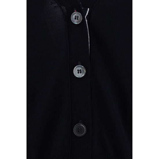 Thom Browne Cardigan made of soft merino wool, featuring a monochrome design and slim fit. Featuring a V-neck with ribbed trim, it has a front button closure and two patch pockets on the front. The brand’s iconic horizontal bands decorate the left arm, adding a distinctive touch. Slight adjustable side slits with buttons complete the garment, for greater freedom of movement. A refined and versatile garment, perfect for smart or casual looks.