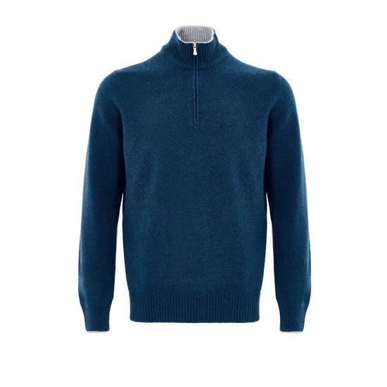 Gran Sasso Blue Wool Half-Zip Mock Sweater. Classic fit, half-zip closure, contrasting collar lining.