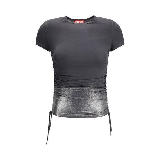 The jersey Top with side drawstrings by Diesel features a slim and slightly stretchy fit, ensuring comfort and a flattering silhouette. The adjustable length, achieved through the side ties, adds a versatile and original touch to the design. It is detailed with a classic round neckline and short sleeves, while the back is adorned with a small metal plaque featuring the iconic Oval D logo. The gradient foil application rising from the hem creates a dynamic and contemporary visual effect, perfect for a modern and distinctive look.