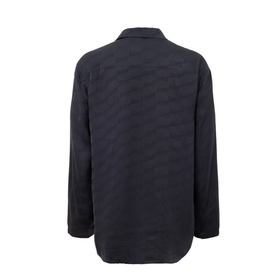 Balenciaga Allover Logo Over Homewear Shirt. In dark grey, allover tone-on-tone logo print, side patch pocket, classic collar, rounded bottom.