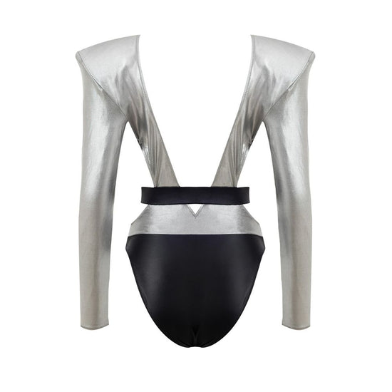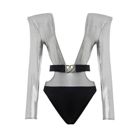 Dolce & Gabbana Silver Long Sleeve Swimsuit. In silver and black, long sleeves, padded shoulders, deep neckline, elasticated belt with removable logo.
