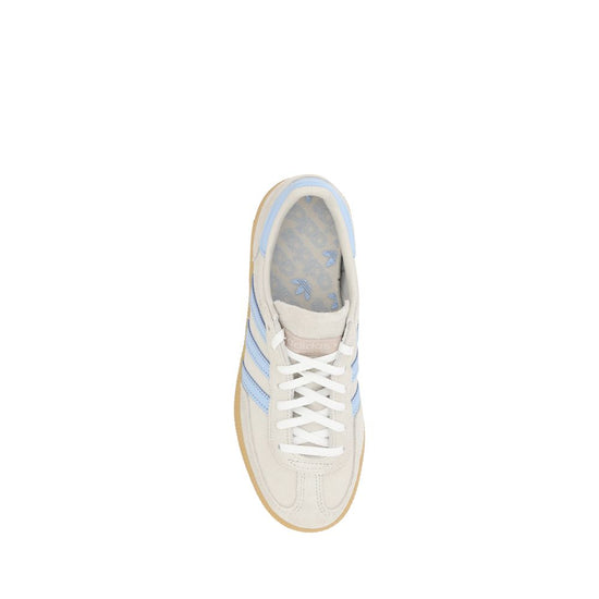 Leather Handball Spezial Sneakers by Adidas featuring an elongated toe, a lace-up front closure, a suede leather design, the brand’s iconic oblique bands applied in contrast on the side panels, a press-stamped sneaker pattern on the outer panel, a logo-embroidered label on the front tab, and a flat sole.