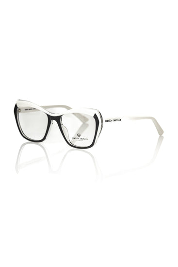 Revitalize your look with the bold aesthetics of Frankie Morello’s cat-eye eyeglasses. Crafted for the chic and the trendsetting, these glasses boast a striking black frame with a contemporary twist of white and transparent accents. Perfect for the confident woman ready to make a statement with her eyewear. Delight in the exceptional quality of Italian design with every glance.