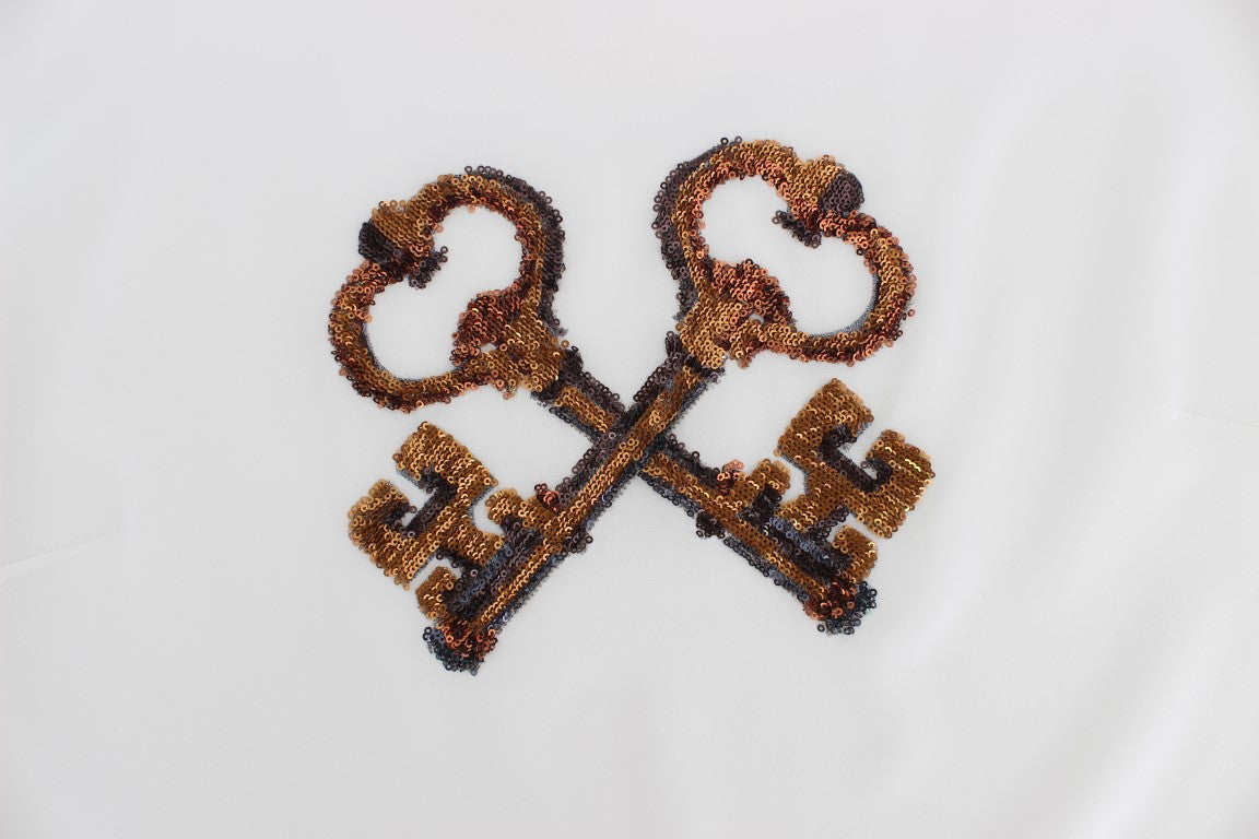 Gorgeous brand new with tags, 100% Authentic DOLCE & GABBANA white silk sequined key blouse top. This item comes from the exclusive MainLine Dolce & Gabbana Collection.